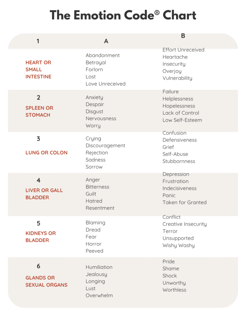 Take a look at The Emotion Code Chart, below, which is how the practitioner narrows down the exact trapped emotion(s) that need to be released in any given moment. This chart is found in Dr. Bradley’s The Emotion Code book.