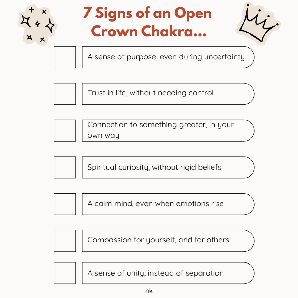 When these beliefs shift, your crown chakra can breathe again. Your intuition grows stronger, and your whole system feels more supported.