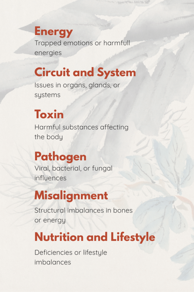 - Misalignments – Structural imbalances in bones, tissues, or energy fields
